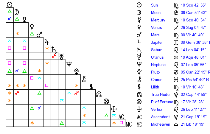 | Sun | 10 Scorpio 42 | 11 Scorpio 31 | 0 Pisces 15 |