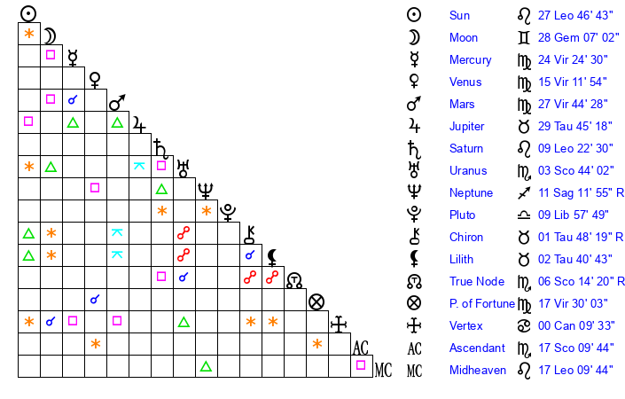 | Mercury | 24 Virgo 24 | 9 Leo 26 | 27 Virgo 41 |