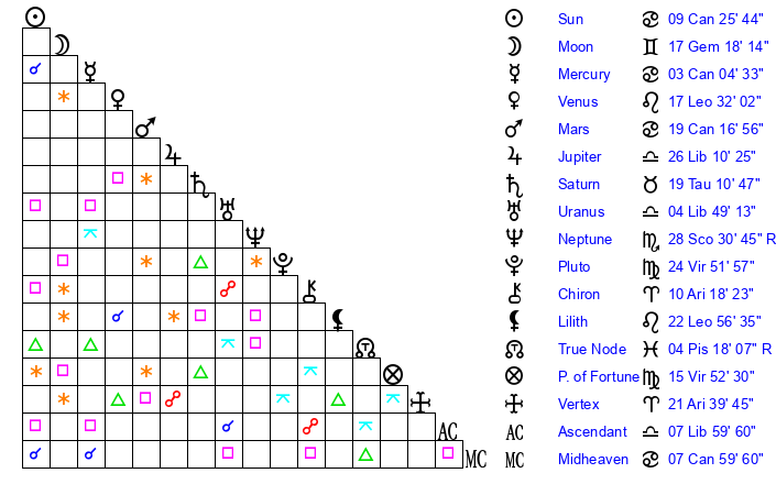 Mars | 19 Cancer 17 | 8 Virgo 11 | 24 Leo 35 |