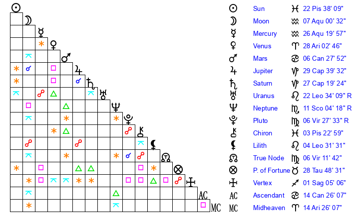 | Sun | 22 Pisces 38 | 23 Pisces 7 | 25 Taurus 20 |