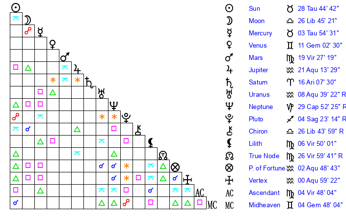 | Sun | 28 Taurus 45 | 28 Taurus 58 | 25 Gemini 34 |
