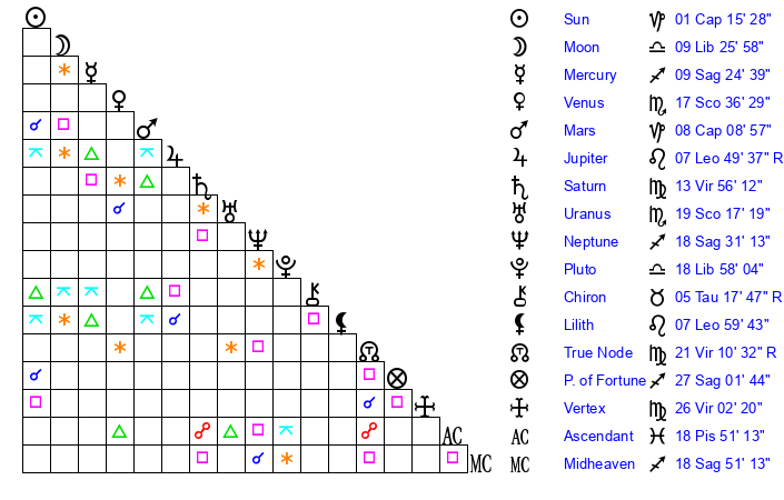 Sun | 1 Capricorn 16 | 2 Capricorn 6 | 18 Aquarius 4 |