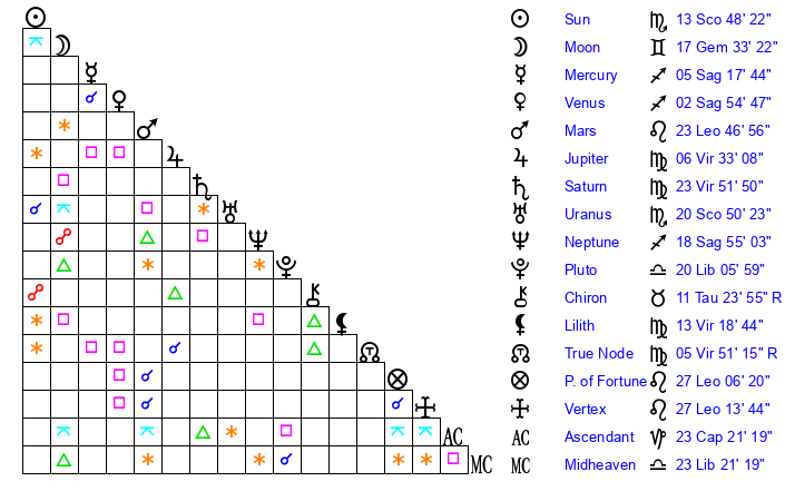 | Sun | 13 Scorpio 48 | 14 Scorpio 54 | 29 Sagittarius 21 |