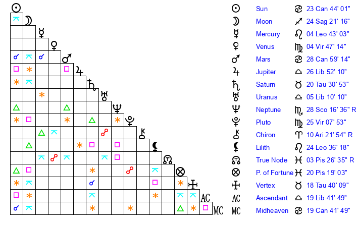 Sun | 23 Cancer 44 | 24 Cancer 25 | 16 Virgo 35 |