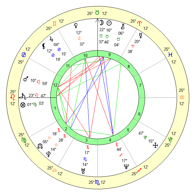 | Moon | 22 Taurus 28 | 22 Virgo 58 | 12 Aquarius 18 |