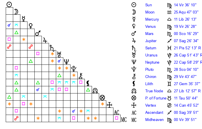 Moon | 25 Aquarius 43 | 14 Pisces 39 | 2 Aries 15 |