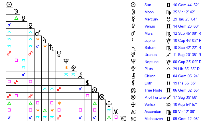 | Moon | 25 Virgo 16 | 2 Scorpio 44 | 24 Pisces 50 |