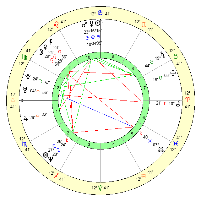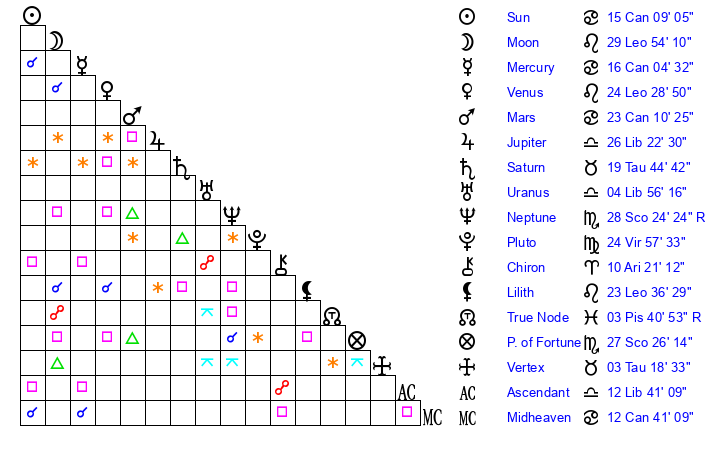 | Sun | 15 Cancer 9 | 15 Cancer 50 | 7 Virgo 52 |