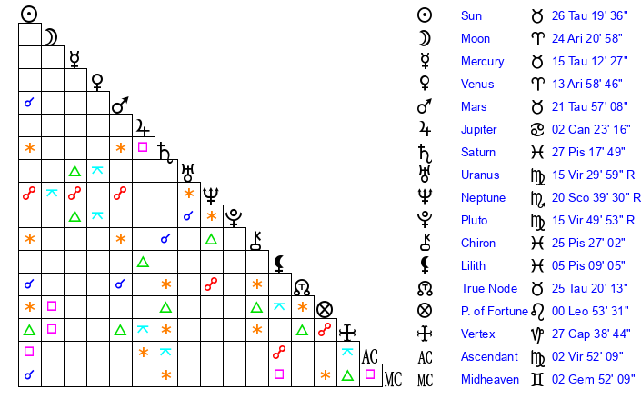| Uranus | 15 Virgo 34 | 27 Taurus 18 | 16 Virgo 45 |