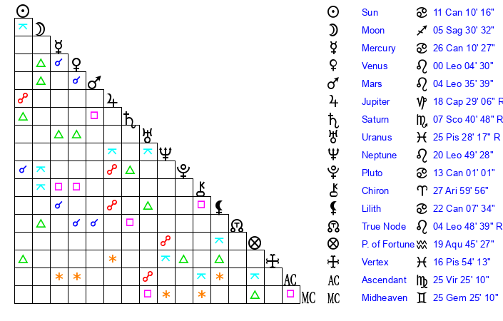 | Moon | 5 Sagittarius 28 | 21 Libra 23 | 8 Leo 20 |