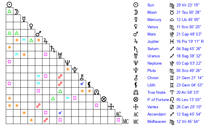 | Saturn | 4 Sagittarius 59 | 28 Pisces 16 | 8 Sagittarius 31 |