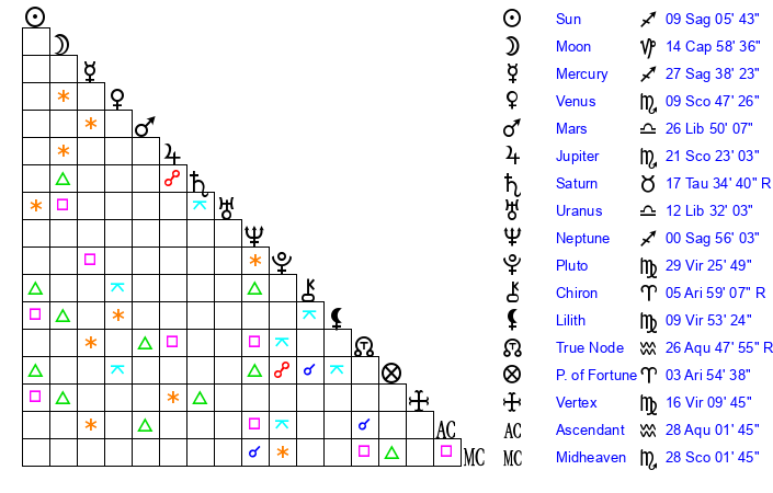 | Sun | 9 Sagittarius 5 | 9 Sagittarius 45 | 5 Aquarius 4 |