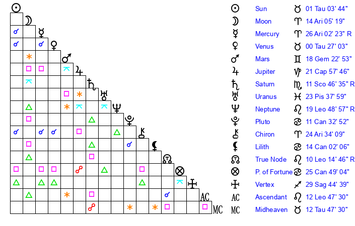 | Moon | 14 Aries 0 | 9 Aquarius 29 | 0 Sagittarius 34 |