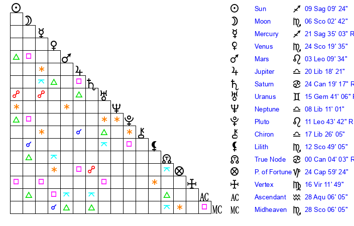 | Sun | 9 Sagittarius 9 | 10 Sagittarius 0 | 29 Aquarius 27 |