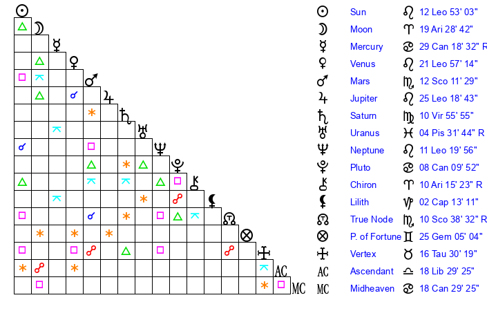 Moon | 19 Aries 25 | 29 Sagittarius 25 | 24 Aquarius 5 |
