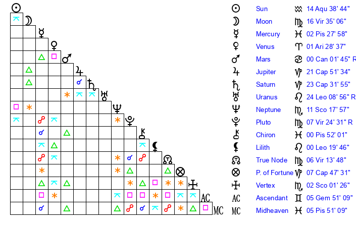 | Moon | 16 Virgo 36 | 23 Aries 41 | 22 Capricorn 20 |
