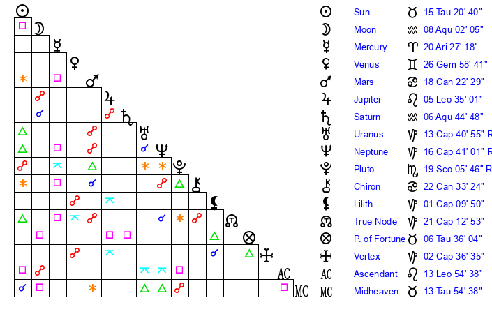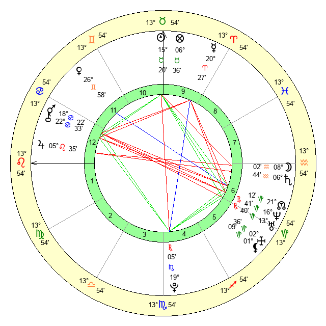Moon | 7 Aquarius 48 | 6 Virgo 54 | 4 Taurus 29 |