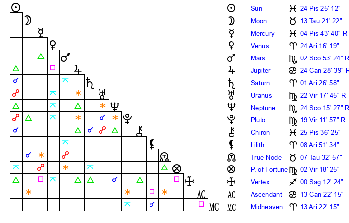 | Moon | 13 Taurus 19 | 10 Libra 51 | 26 Gemini 19 |