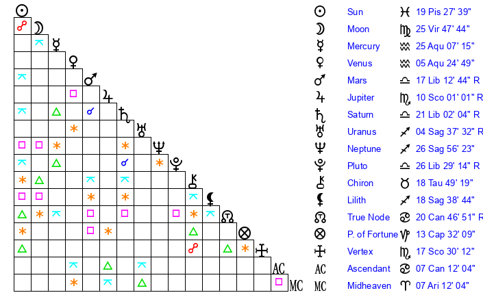 | Sun | 19 Pisces 28 | 20 Pisces 2 | 1 Taurus 55 |