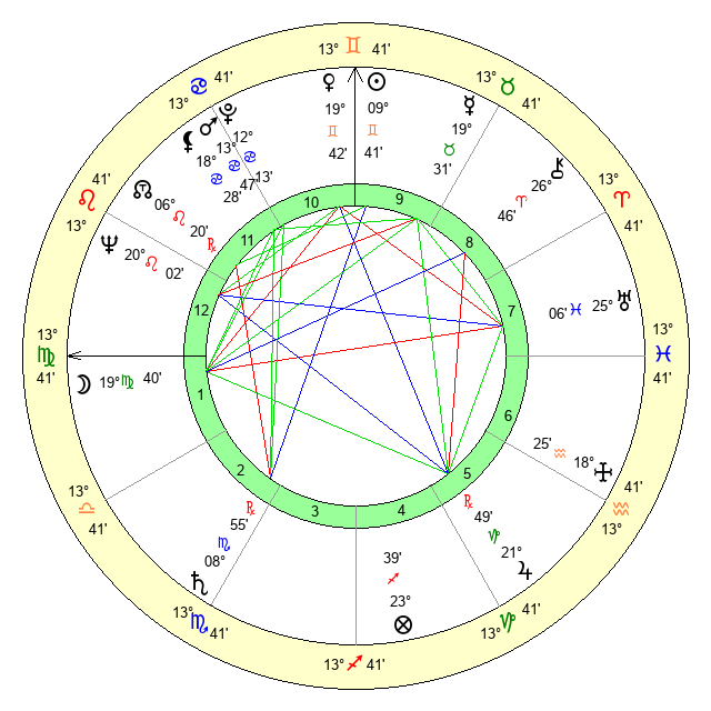 | Moon | 19 Virgo 30 | 11 Leo 44 | 0 Gemini 52 |