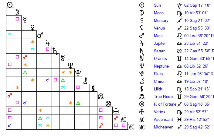 | Venus | 22 Sagittarius 56 | 19 Aquarius 29 | 2 Aries 0 |