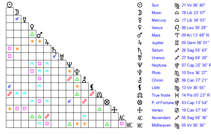 Moon | 18 Libra 29 | 11 Gemini 23 | 25 Aquarius 52 |