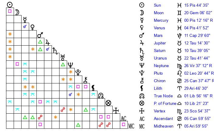 | Sun | 15 Pisces 44 | 16 Pisces 22 | 7 Gemini 54 |