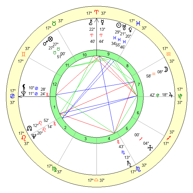 | Sun | 29 Pisces 35 | 0 Aries 20 | 6 Cancer 27 |