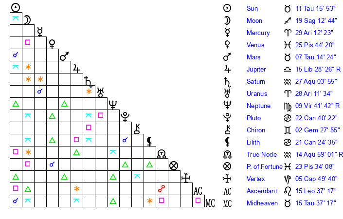 | Sun | 11 Taurus 16 | 12 Taurus 13 | 8 Leo 24 |