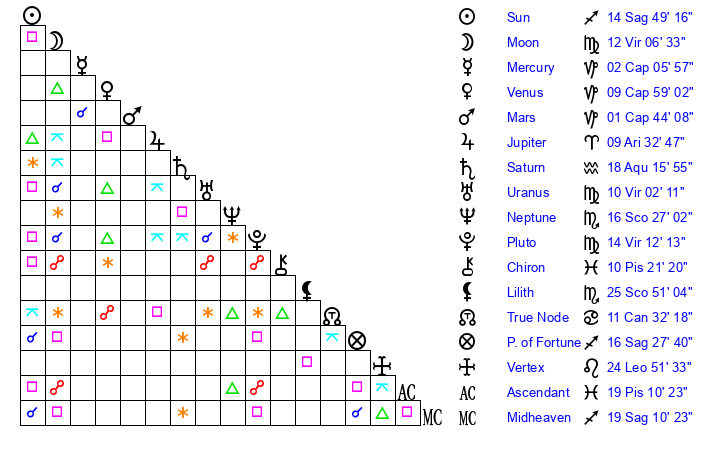 | Pluto | 14 Virgo 12 | 2 Aquarius 3 | 13 Virgo 33 |