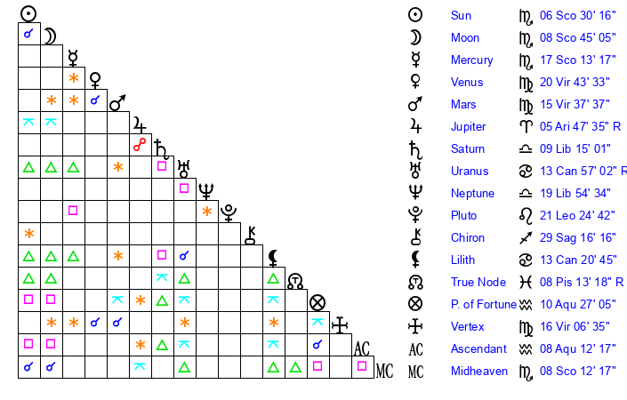 | Neptune | 19 Libra 54 | 27 Pisces 31 | 21 Libra 40 |