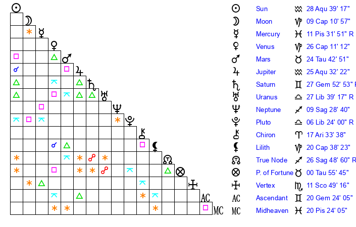 | Sun | 28 Aquarius 39 | 29 Aquarius 17 | 19 Aries 27 |