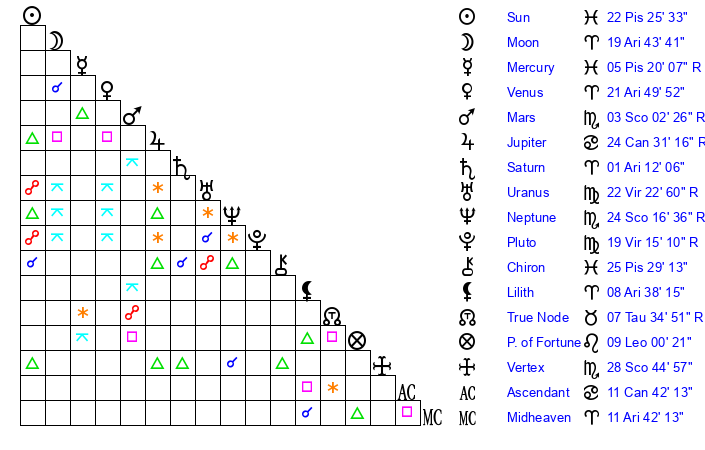 | Sun | 22 Pisces 26 | 23 Pisces 22 | 19 Taurus 21 |