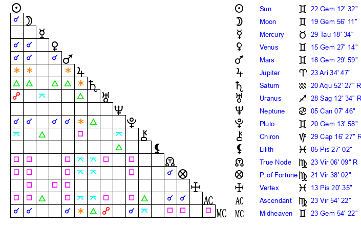| Sun | 22 Gemini 12 | 22 Gemini 56 | 18 Libra 56 |