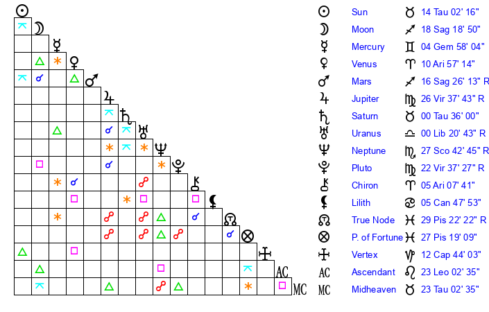 | Saturn | 0 Taurus 47 | 28 Pisces 7 | 6 Taurus 51 |