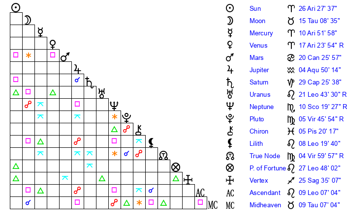 | Moon | 15 Taurus 8 | 7 Sagittarius 6 | 9 Virgo 39 |