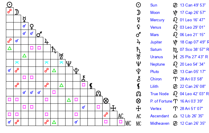 Pluto | 13 Cancer 6 | 3 Aquarius 0 | 14 Cancer 45 |