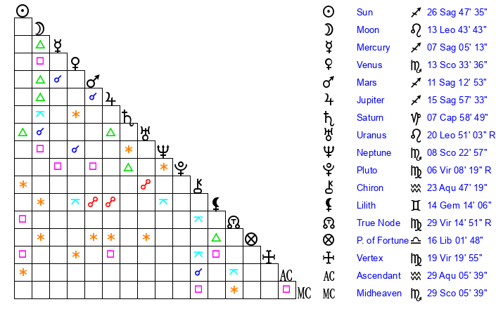| Sun | 26 Sagittarius 47 | 28 Sagittarius 2 | 2 Pisces 50 |