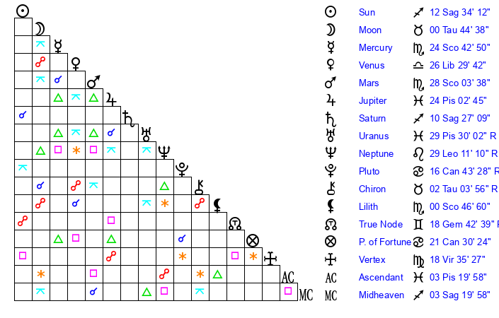 | Moon | 0 Taurus 54 | 24 Gemini 18 | 0 Sagittarius 39 |
