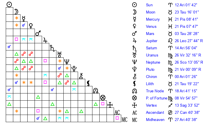 Sun | 12 Aries 2 | 12 Aries 13 | 7 Gemini 24 |
