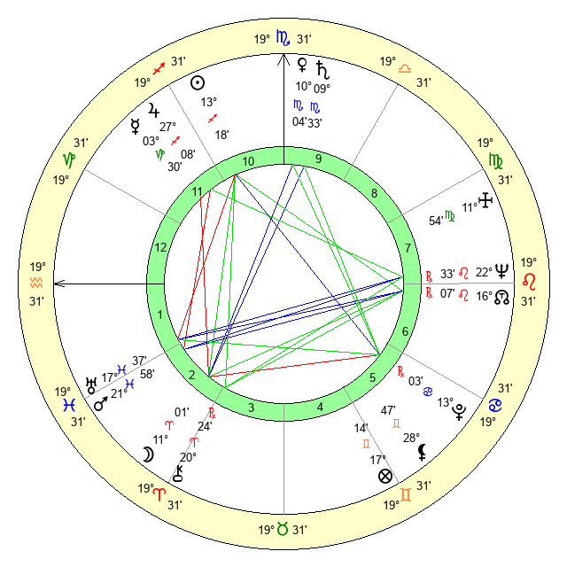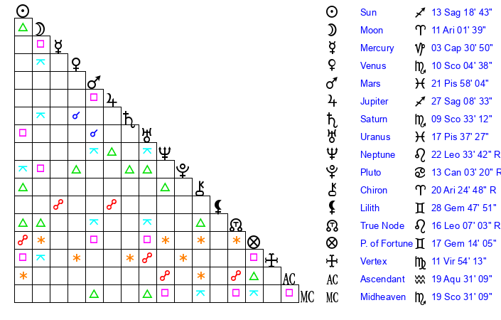Saturn | 10 Scorpio 4 | 12 Pisces 59 | 14 Scorpio 29 |