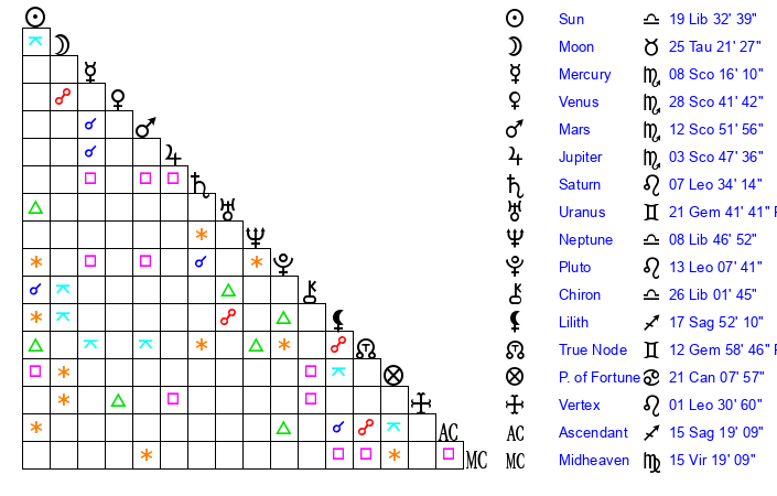 | Moon | 25 Taurus 6 | 17 Cancer 0 | 9 Aries 4 |