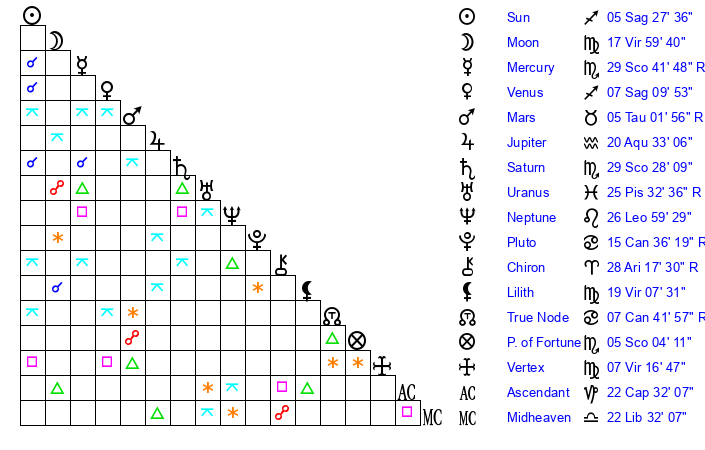 | Moon | 17 Virgo 59 | 8 Pisces 32 | 7 Taurus 10 |