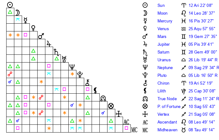 | Moon | 14 Leo 39 | 9 Gemini 27 | 24 Gemini 6 |