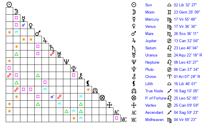 | Moon | 23 Gemini 21 | 24 Scorpio 49 | 16 Taurus 39 |