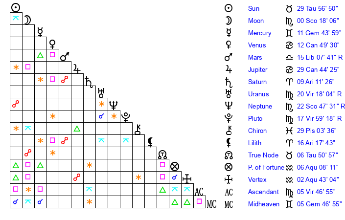 | Neptune | 22 Scorpio 47 | 1 Aries 39 | 21 Scorpio 39 |