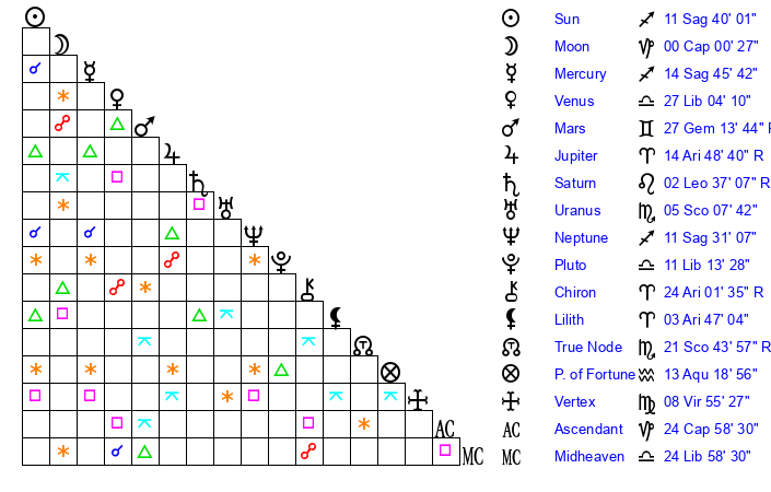 | Sun | 11 Sagittarius 40 | 12 Sagittarius 32 | 2 Aquarius 34 |