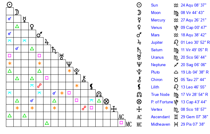 Saturn | 12 Virgo 14 | 18 Pisces 45 | 8 Virgo 46 |