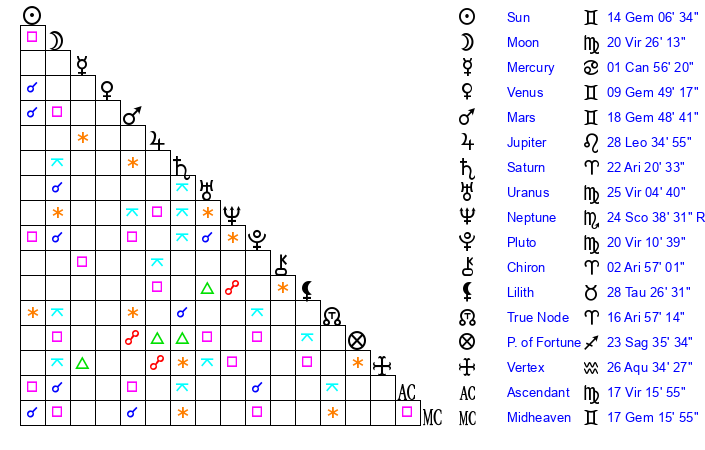 Sun | 14 Gemini 7 | 14 Gemini 19 | 8 Leo 31 |