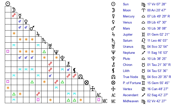 | Sun | 17 Virgo 7 | 17 Virgo 16 | 5 Scorpio 24 |